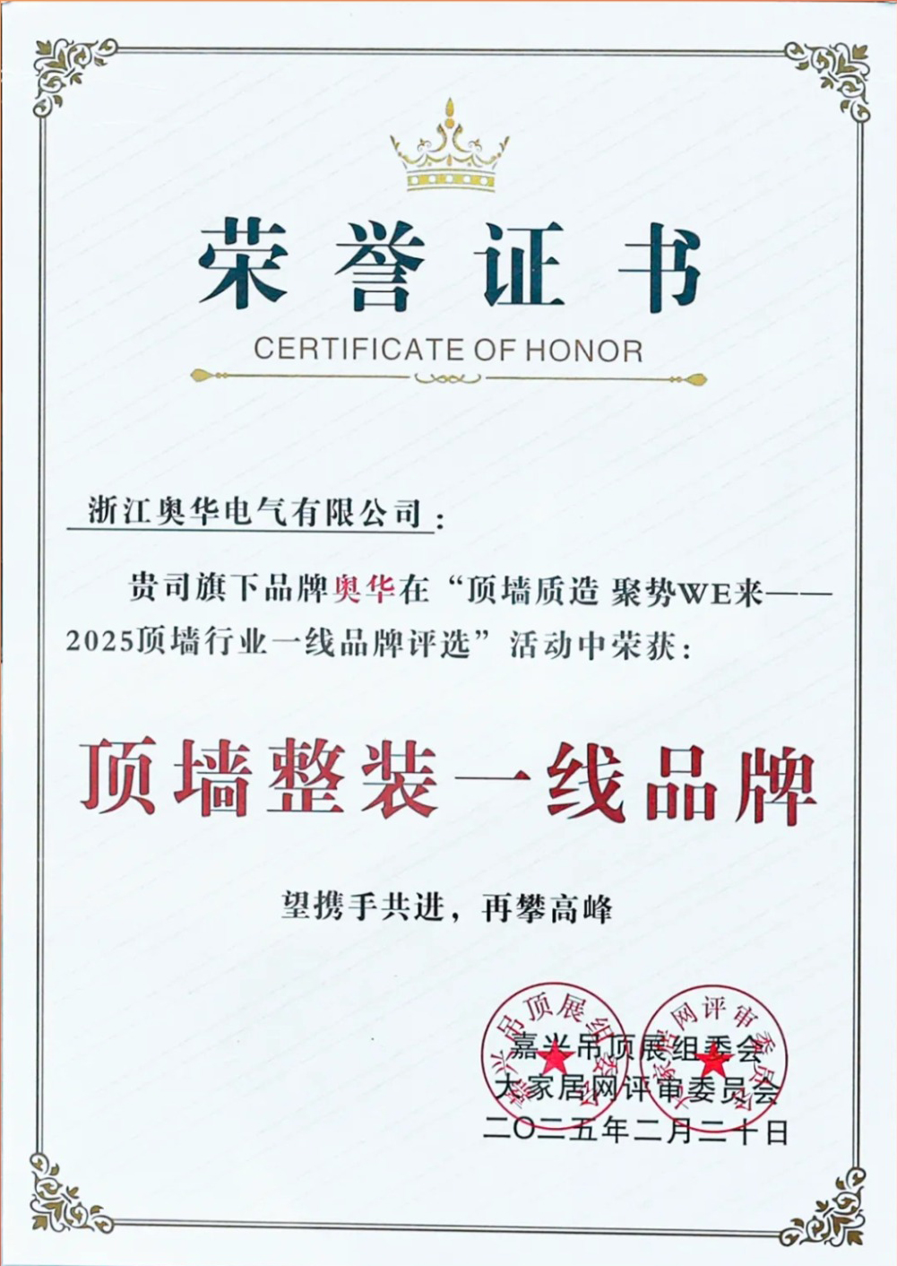 品牌榮譽 | 奧華榮獲“2025頂墻整裝一線品牌”